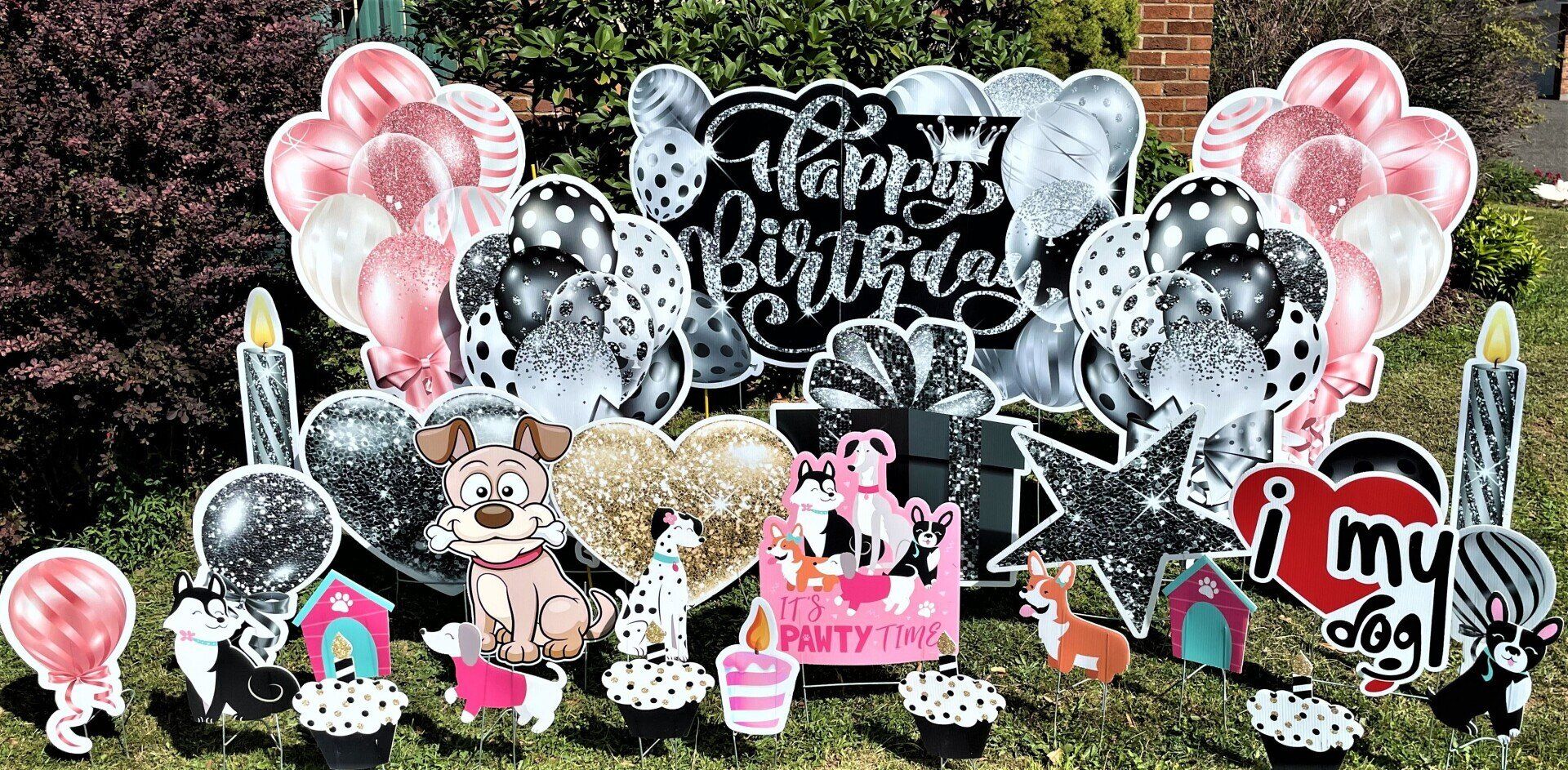 We are a full service company that designs, delivers, and sets up lawn sign displays for all your special occasions ! We offer vibrant exciting packages for birthdays, new babies, anniversaries, graduations, proposals, and more. Each display is colorful, up-to-date and is designed around specific themes of your choice. Check out our "WOW factor" package page and see the photos of each display style.
